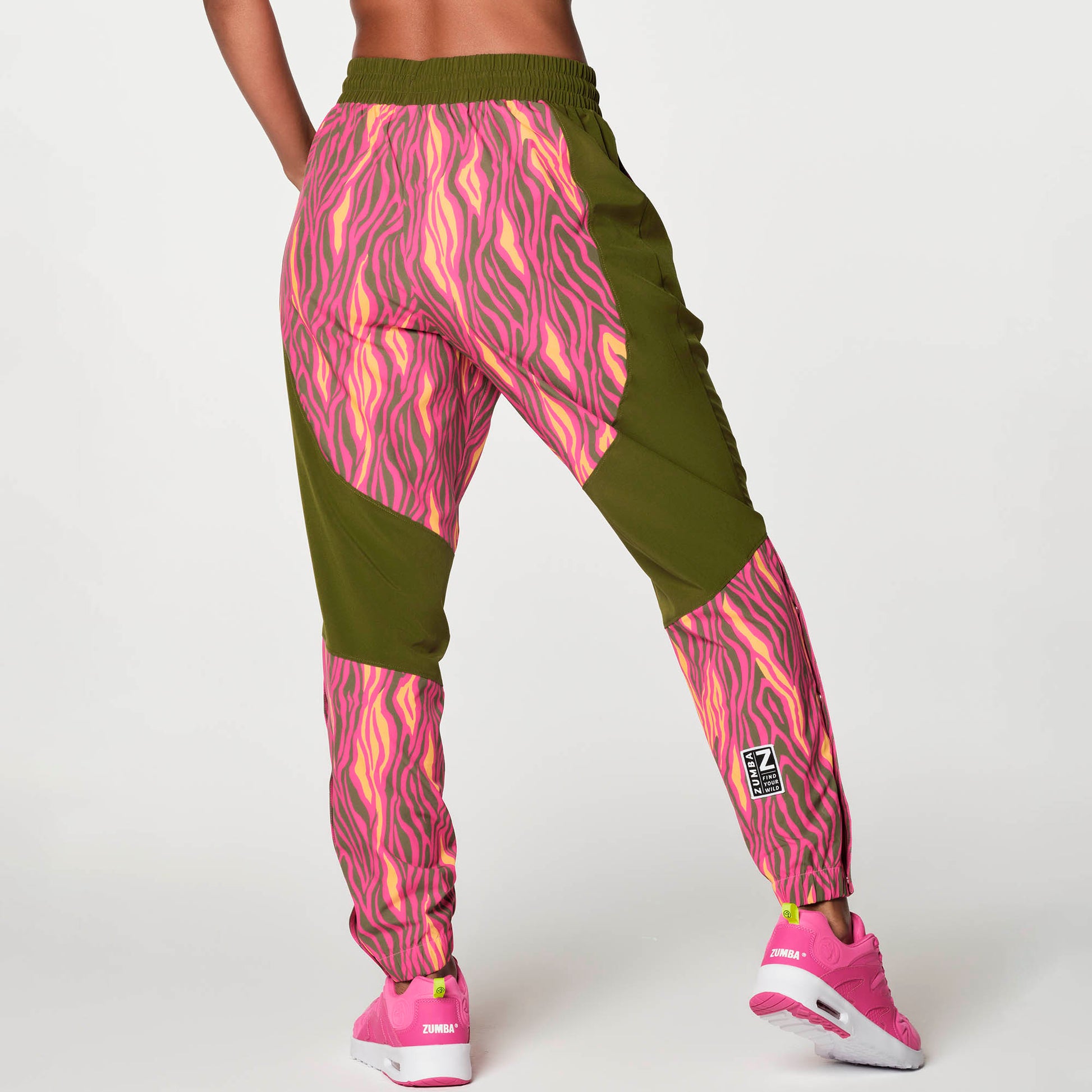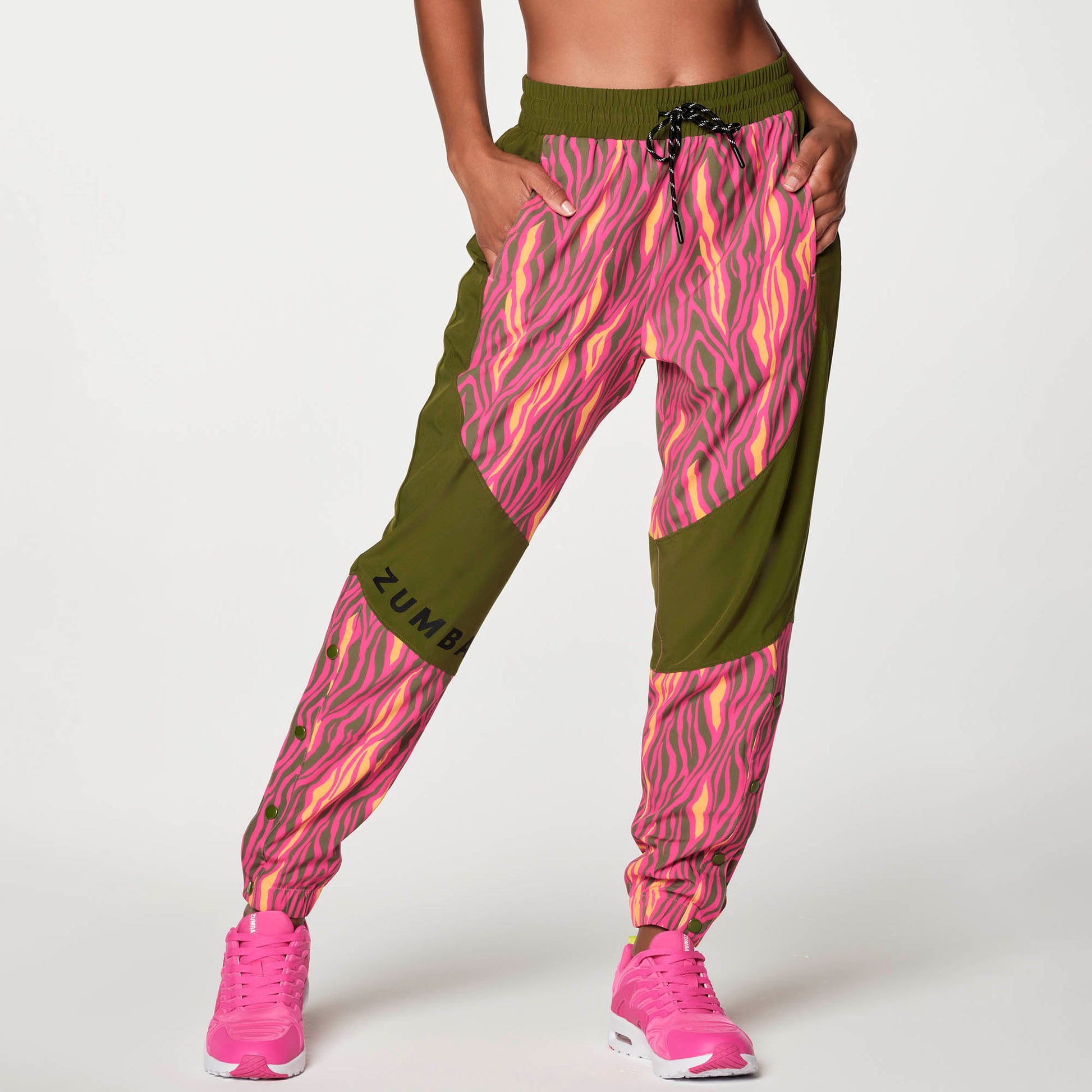 Stand out in the Zumba Chillin' Track Pants with bold color blocking and convenient snap plackets that can be opened on outer calves.