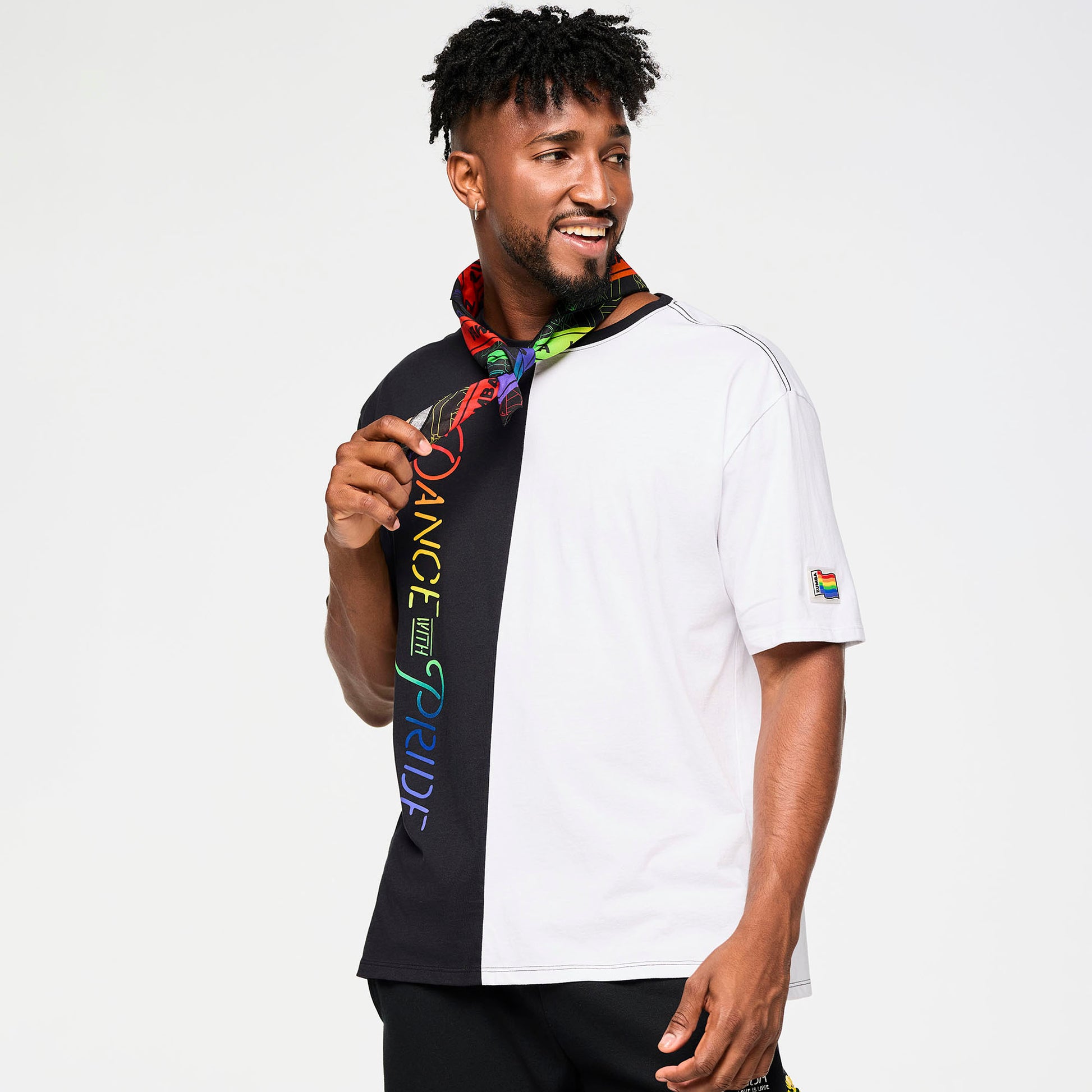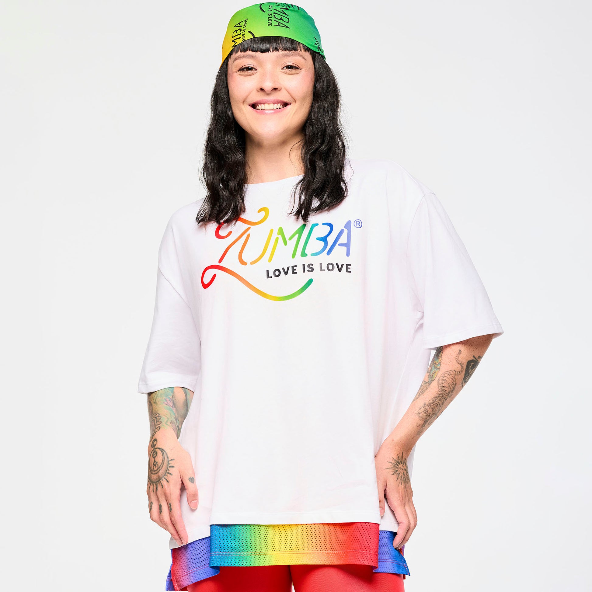 • Bandana #1 is covered in Zumba fanatics dancing, waving flags, and spreading Zumba love in a bright rainbow gradient